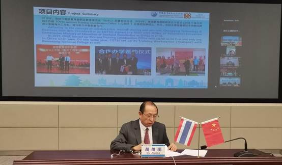 会上,副校长胡继明围绕项目的主要内容、创新经验以及成果特色等方面作了主题发言。他指出,该项目通过“学习+实训”“文化+技能+工匠精神”的人才培养模式,着力培养具有国际视野、通晓中国文化、既能适应中国“走出去”企业需求,又能适应本土国家和区域经济发展的专业人才。数字媒体应用技术专业“1.5+1.5”联合培养项目,成为泰国教育部职教委与中国高职院校直接合作开展的首个学历留学生项目。我校作为国家“双高计划”建设单位,将在国际化人才培养标准制定、鲁班工坊建设、服务企业“走出去”、国际在线课程的建设等方面不断深化和探索创新,也将进一步加强与东盟各国职业教育院校的联系,积极扩大教育合作的国际“朋友圈”,为构建中国—东盟职教合作命运共同体作出积极贡献。