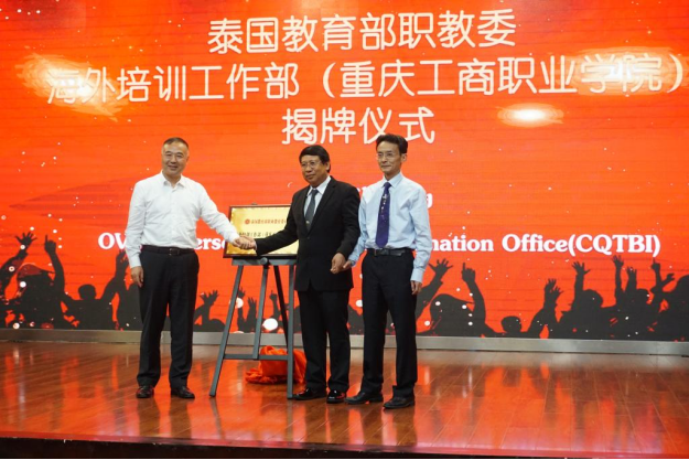 【供稿/国际合作交流处】6月17日上午,泰国教育部职教委重庆工商职业学院海外工作培训部(OVEC oversea Training Coordination Office(CQTBI))揭牌仪式暨2019春季泰国留学生结业典礼在学校合川校区科学会堂举行。泰国教育部职教委副秘书长帕恰康·强塔拉奇,我校党委书记郭庆、校长李国、副校长江涛,泰国教育部职教委官员、职业院校校长、教师代表团一行21人,我校各二级学院以及相关职能部门负责人,留学生、教师代表等近200人参加了活动。活动由副校长胡继明主持。