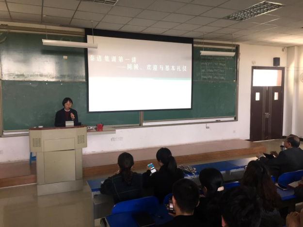 为进一步推进我校国际化办学进程,做好泰国留学生培养工作,3月15日下午,国际合作交流处举办的泰语强化培训班第一讲在C302教室如期开班,胡继明副校长、泰国留学生所在学院负责人、留学生管理人员和专业课教师、学生志愿者,以及相关职能部门工作人员100余人参加了此次培训。