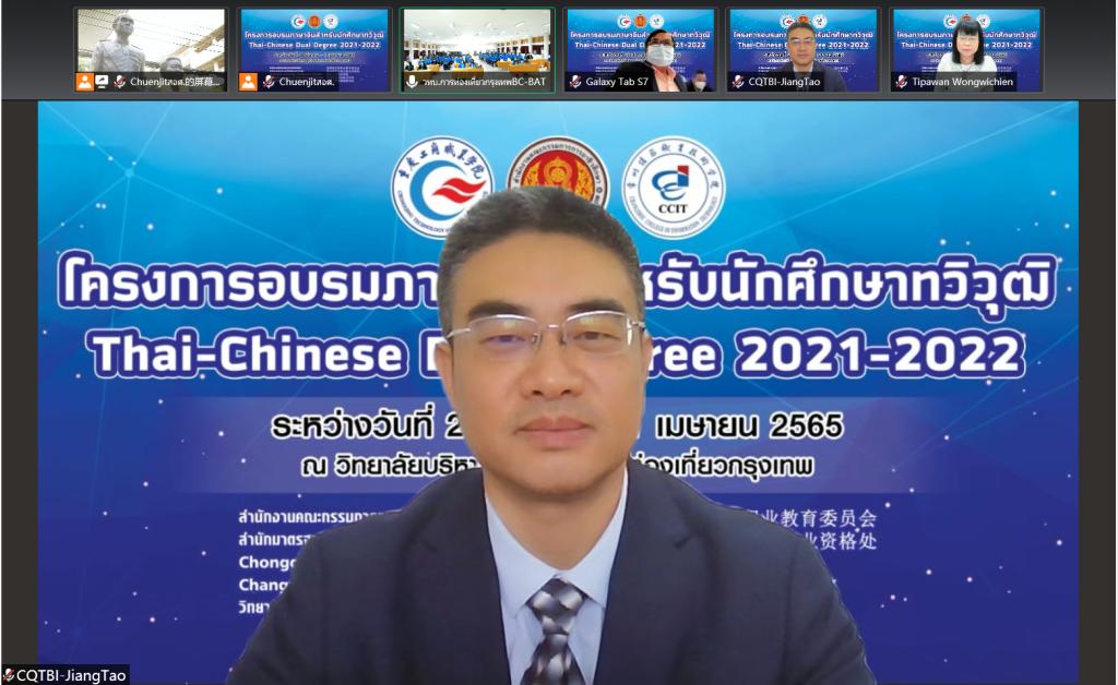 【供稿/陈璐洋】3月28日上午,由泰国教育部职业教育委员会、常州信息职业技术学院和我校联合举办的“2021-2022年中泰双学历留学生汉语培训项目”如期开幕。党委委员、副校长江涛受邀出席线上开幕式并致辞。泰国教育部职教委下属高职院校有关领导、教师代表及我校2020级、2021级全体泰国留学生在曼谷当地参加本次活动。