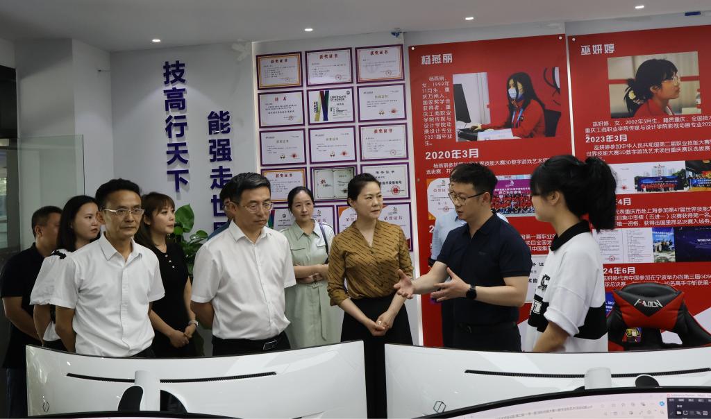 与会领导还考察了学校承建的第47届世界技能大赛3D数字游戏艺术中国集训基地,听取了学校对于基地建设和选手备赛情况的汇报,并看望慰问了即将赴法国参加第47届世界技能大赛3D数字游戏艺术赛项的中国集训队选手。