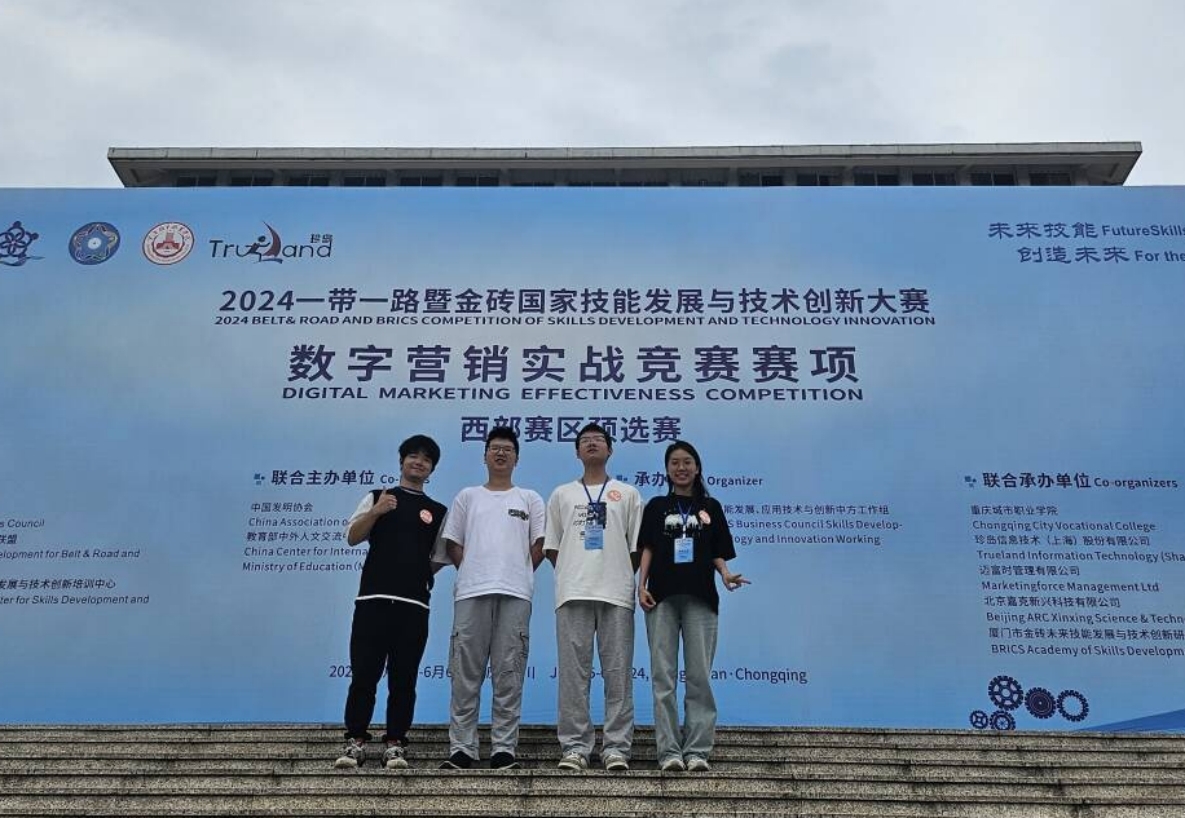 【供稿/管理学院】6月6日,由金砖国家工商理事会中方理事会、一带一路暨金砖国家技能发展国际盟、中国科协“一带一路”暨金砖国家技能发展与技术创新培训中心主办的“2024一带一路暨金砖国家技能发展与技术创新大赛之数字营销实战竞赛赛项西部赛区预选赛”在重庆城市职业学院举行。我校管理学院网络营销与直播电商专业和市场营销专业学生组队参赛,荣获二等奖两项,同时获得国赛参赛资格。
