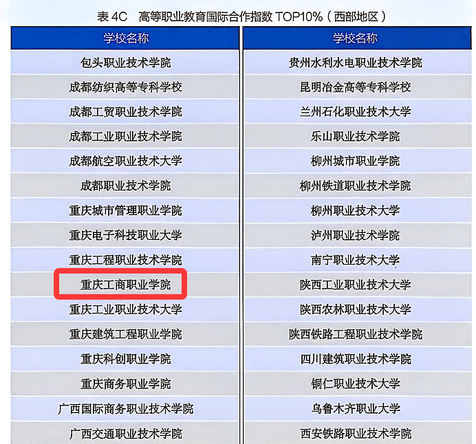 【供稿/质量管理处】近日,由中国教育科学研究院牵头编制的《中国职业教育质量年度报告(2024年度)》发布,重庆工商职业学院入选西部地区“高等职业教育人才培养指数TOP10%”“高等职业教育服务贡献指数TOP10%”“高等职业国际合作指数TOP10%”和“高等职业教育产教融合指数TOP10%”四项卓越榜单。