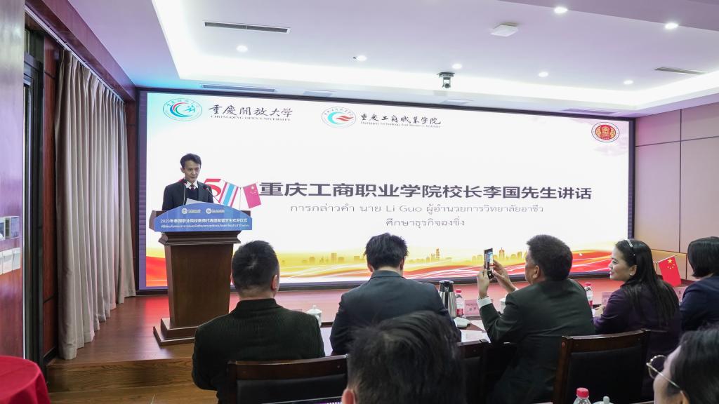 李国校长为留学生们颁发校徽。李国校长指出,学校将积极与泰国教育部及各职业院校携起手来,探索符合中泰两国发展之路的职业教育新路径,为推动新时代的国际职业教育作出新贡献。他对国际留学生提出期望和要求,一是珍惜时光、勤奋学习;二是敢于拼搏、敢于追梦;三是文化交流、学习互鉴。