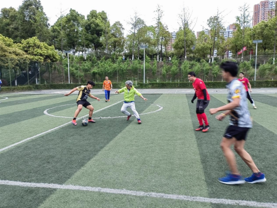 17点35分,一场没有裁判的比赛正式开始。双方队员你争我夺,奋力拼搏,很快进入了比赛状态。足球场上,留学生们尽力拼搏,奔跑如离弦之箭,喊声振奋人心。青春的活力在足球场上迸发,没有拘束,没有忧虑,欢笑声不断在绿茵场上回荡着。足球场上没有国界,有留学生滑倒了,我们的教职工赶紧上前拉起来。同样,比赛中稍有碰撞后大家也立即握手相拥。随着时间的悄然流逝,比赛很快进入了白热化,虽然来回奔跑很辛苦,但是他们都一次又一次地奋力冲刺。中场休息过后,下半场比赛继续进行。比赛双方都及时调整了进攻与防守战略,好球一个接一个出现,令人心潮澎湃。最终,经过90分钟的激烈角逐,双方以平局收场。比赛的结果并不重要,重要的是我们赛出了重庆工商教职工的精气神,赛出了留学生的风采。整场比赛中,双方观战球迷热情高涨,球场上不时掌声雷动。赛后,双方队员亲切握手拥抱,真正赛出了风格,赛出了友谊。