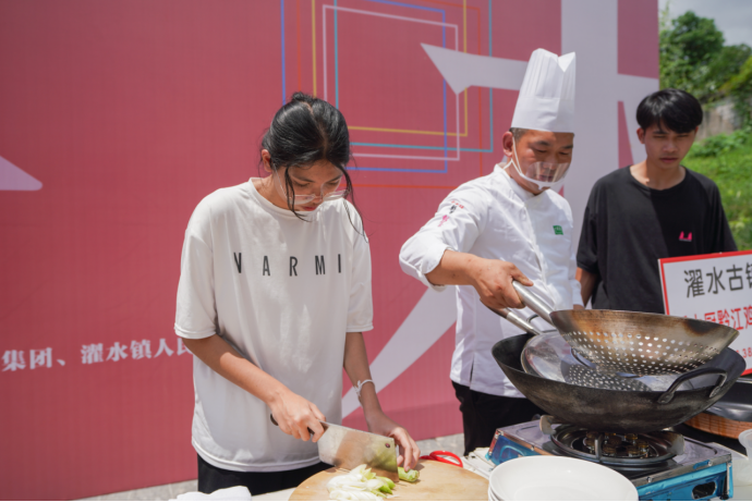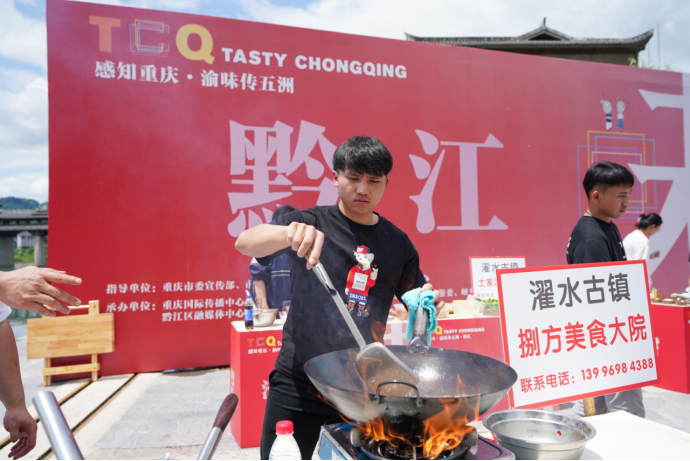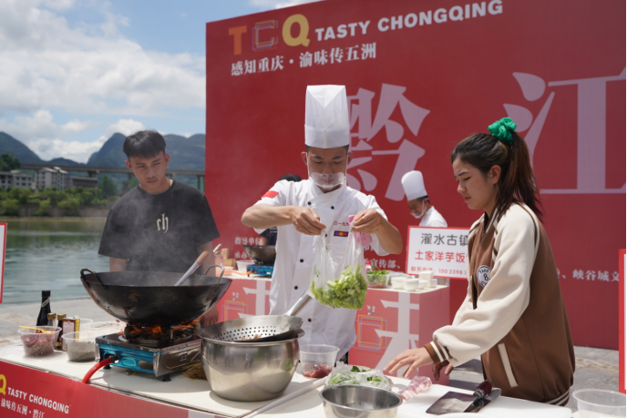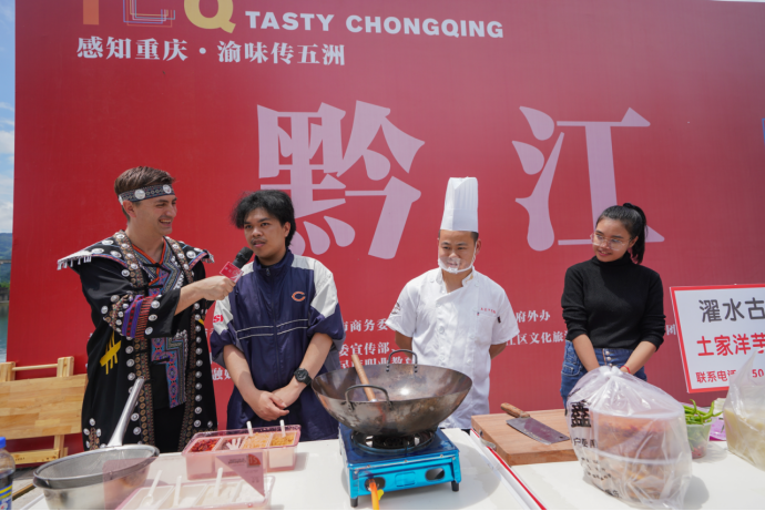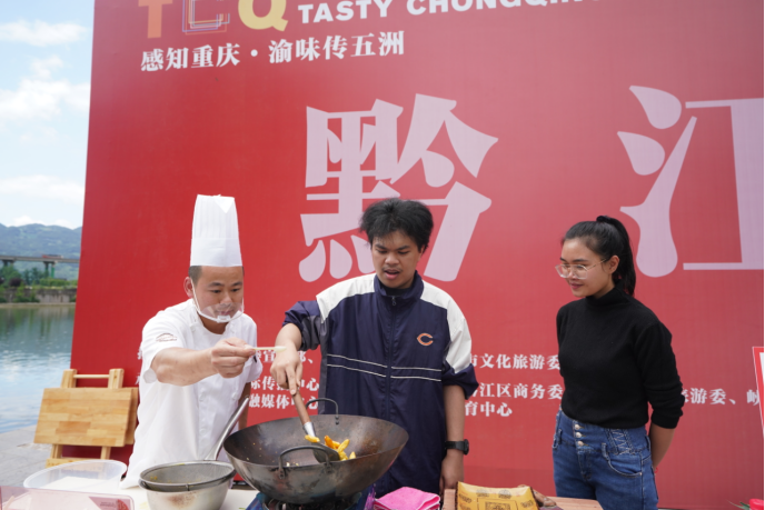 黔江鸡杂、神豆腐、青菜牛肉、土家腊肉、绿豆粉、扣肉、土家酸渣肉、马打滚、渣海椒、南瓜鱼……哪一道菜是你的最爱?当天下午,“感知重庆·渝味传五洲·黔江”专场活动在美丽的濯水古镇举行。炒调料、烧水、切菜、下锅、翻炒……活动现场,在当地大厨们的悉心指导下,这些留学生纷纷找到了自己心仪的中国美食,并认真学习了制作方法。半小时后,美食开始陆续出锅,被一一端到了评委们的面前,从味感、质感、观感、营养均衡、创新方面对其进行了评审。